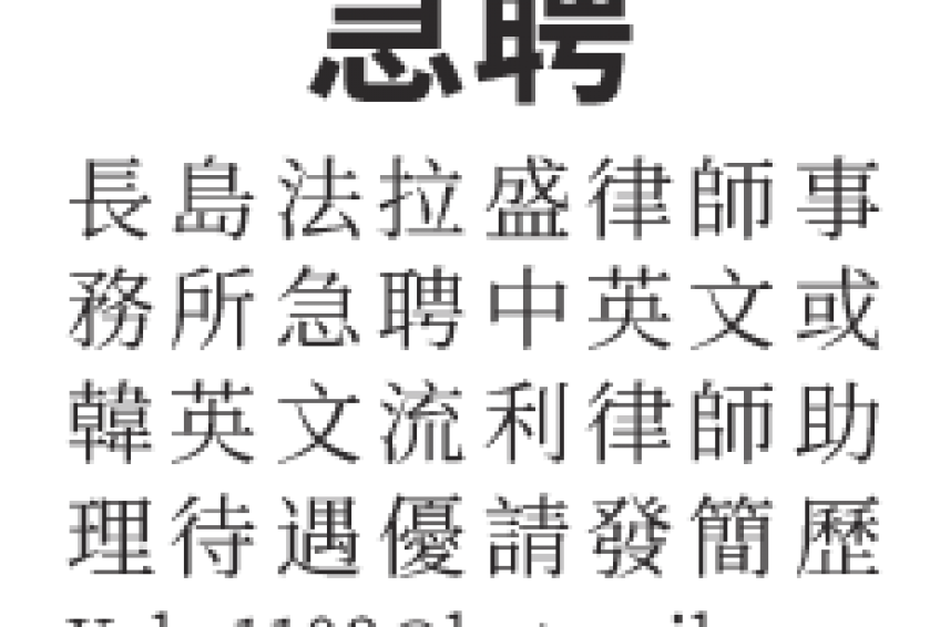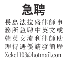 长岛法盛律师事务所急聘中英文或韩英文流利律師助理待遇優請發簡歷:Xckc1103@hotmail.com