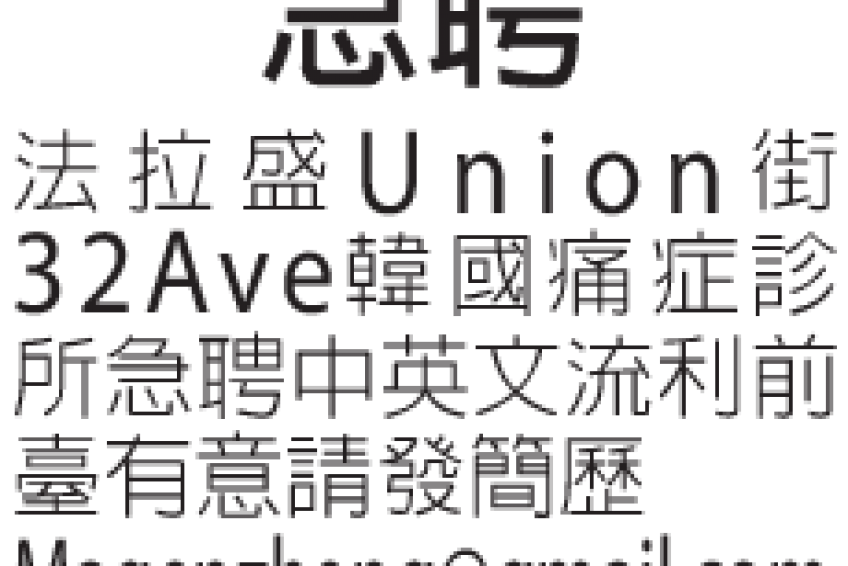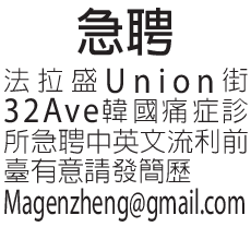 位於法拉盛union street 32Ave. 韓國痛症診所急聘中英文流利的前臺,有意請發簡歷: