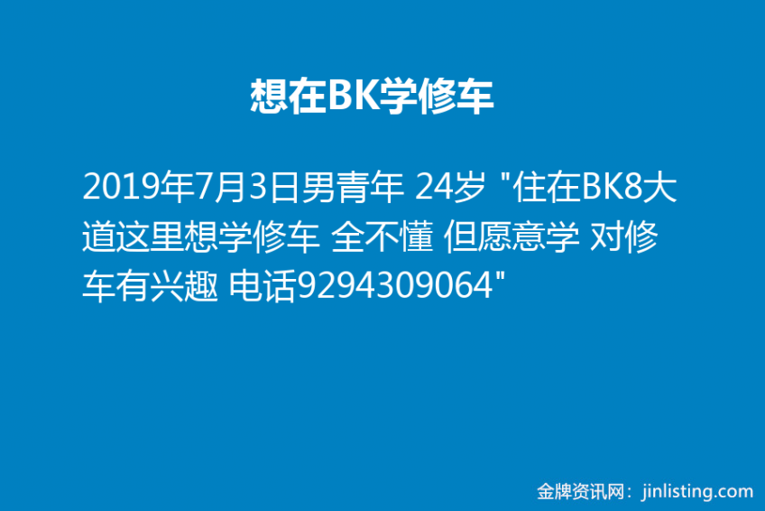 想在BK学修车 男青年 24岁 “住在BK8大道这里想学修车 全不懂 但愿意学 对修车有兴趣 电话9294309064”