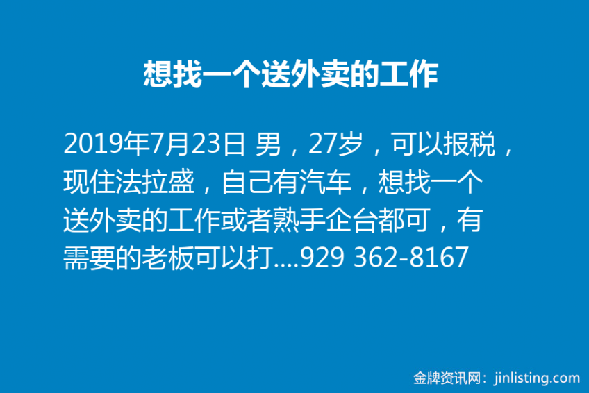 男,27岁,可以报税,现住法拉盛,自己有汽车,想找一个送外卖的工作或者熟手企台都可,有需要的老板可以打电话: 929 362-8167