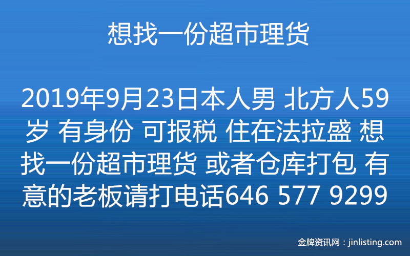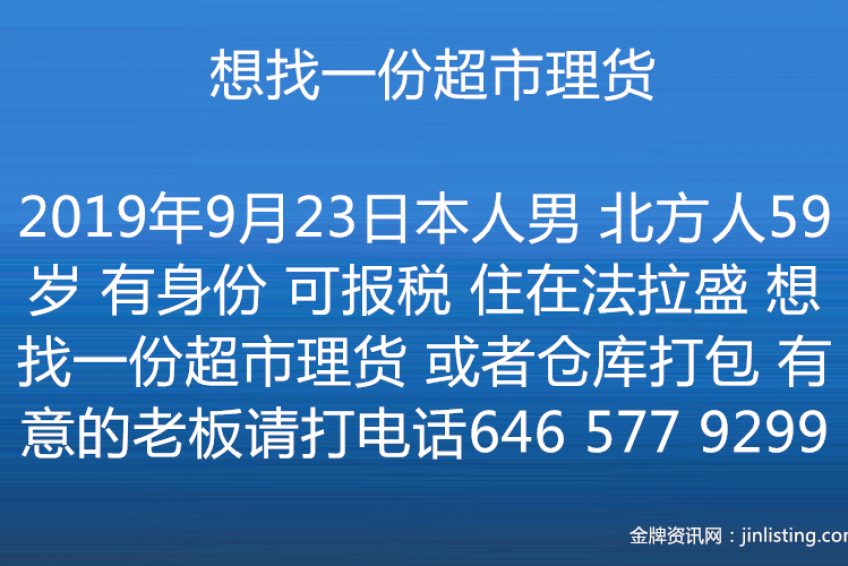 男 59岁 有身份 可报税 本人男 北方人 59岁 有身份 可报税 住在法拉盛 想找一份超市理货 或者仓库打包 有意的老板请打电话646 577 9299 谢谢