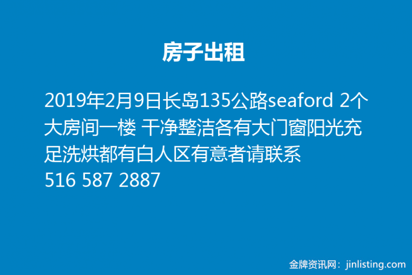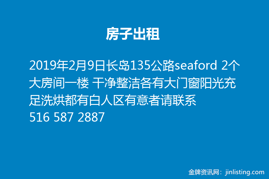 房子出租 长岛135公路seaford 2个大房间一楼 干净整洁各有大门窗阳光充足洗烘都有白人区有意者请联系516 587 2887