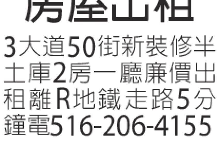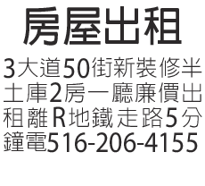 3大道50街新裝修半土庫兩房一廳廉價出租,離R地鐵走路5分鐘有意者請聯繫516-206-4155