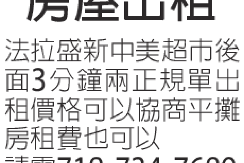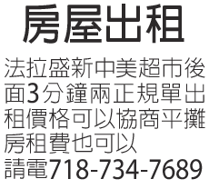 兩正規單出租,在法拉勝新中美超市後面3分鐘,房子價格可以協商,平攤房租費也可以。718-734-7689
