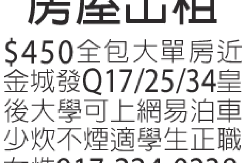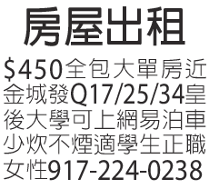 城發皇後大學Q17/25/34可上網易泊車少炊不煙適學生正職女性電917-224-0238