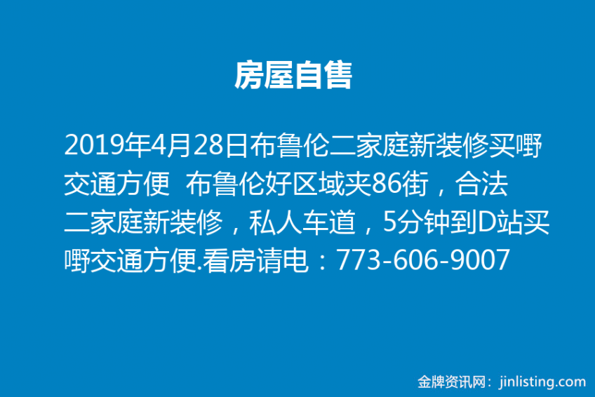 房屋自售,布鲁伦二家庭新装修买嘢交通方便 布鲁伦好区域夹86街,合法二家庭新装修,私人车道,5分钟到D站买嘢交通方便.看房请电:773-606-9007