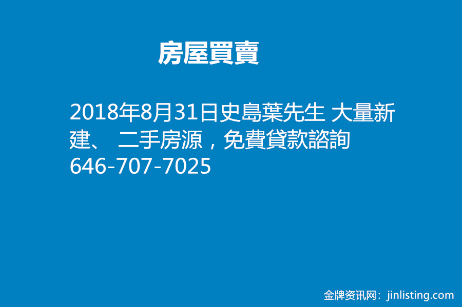 史島葉先生  大量新建、 二手房源, 免費貸款諮詢      646-707-7025