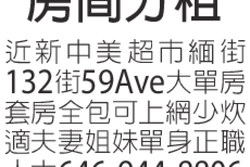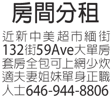 法拉盛近新中美超市緬街59Ave 132 ST大單房 套房出租全包可上網 少炊 適夫妻姐妹單身正職人士 電聯李先生646-944-8806
