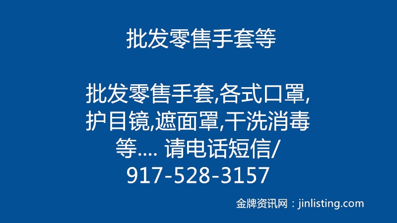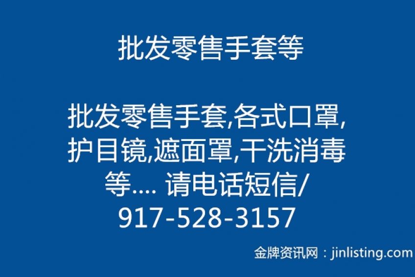 批发零售手套,各式口罩,护目镜,遮面罩,干洗消毒等…. 请电话短信/917-528-3157