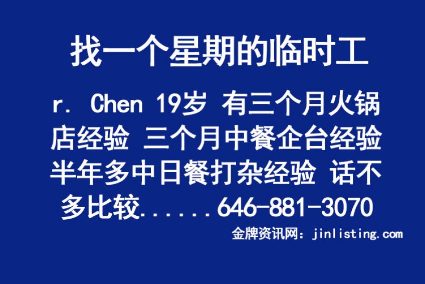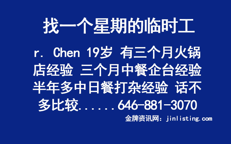 找一个星期的临时工!!r. Chen 19岁 有三个月火锅店经验 三个月中餐企台经验 半年多中日餐打杂经验 话不多比较内向 认真好学,干活利索,吃饭两分钟。 美国公民。 可用时间10am – 12pm 646-881-3070 (如果没接,麻烦请发短信!谢谢!)