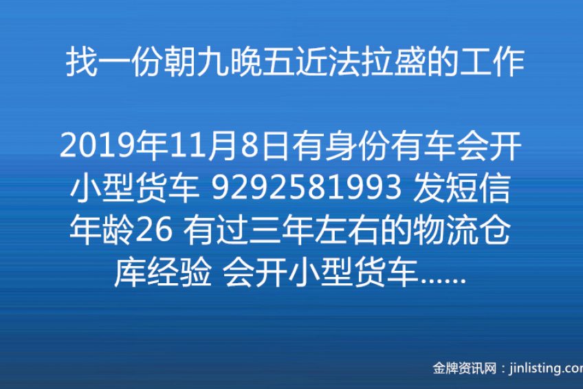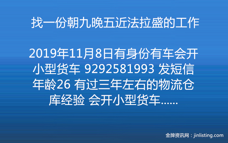 找一份朝九晚五近法拉盛的工作 有身份有车会开小型货车 9292581993 发短信 年龄26 有过三年左右的物流仓库经验 会开小型货车 想找个近法拉盛 朝九晚五的稳定工作