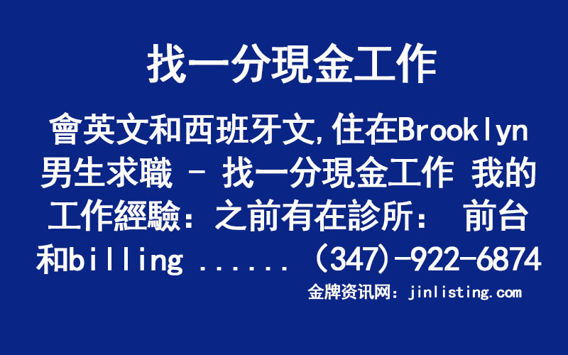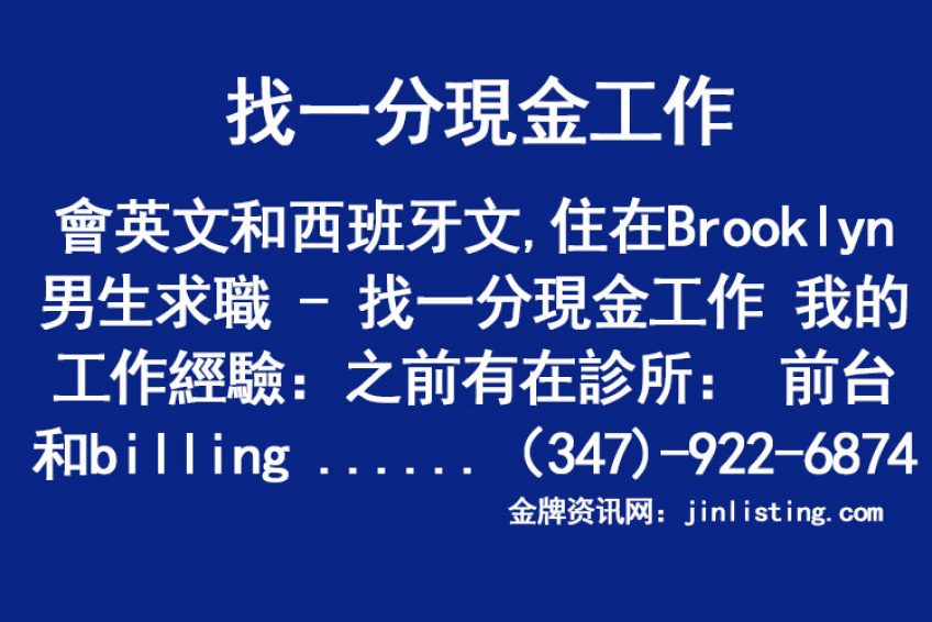 找一分現金工作 – 會英文 和 西班牙文。 住在 Brooklyn 男生求職 – 找一分現金工作 我的工作經驗: 之前有在診所: 前台 和billing 在藥房 – filling prescriptions, 六合彩, Cashier 在酒店做 前台的工作 醫療保險公司- 客戶服務, 接電話, 公司電腦軟件, 活動 學習能力強 有需要請聯繫我的電話(347)-922-6874 謝謝.