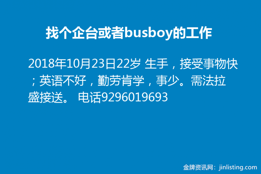 22岁 生手,接受事物快;英语不好,勤劳肯学,事少。需法拉盛接送。 电话9296019693