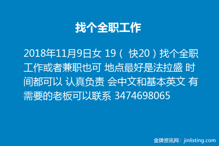 女 19( 快20)找个全职工作或者兼职也可 地点最好是法拉盛 时间都可以 认真负责 会中文和基本英文 有需要的老板可以联系 最好短信给我3474698065