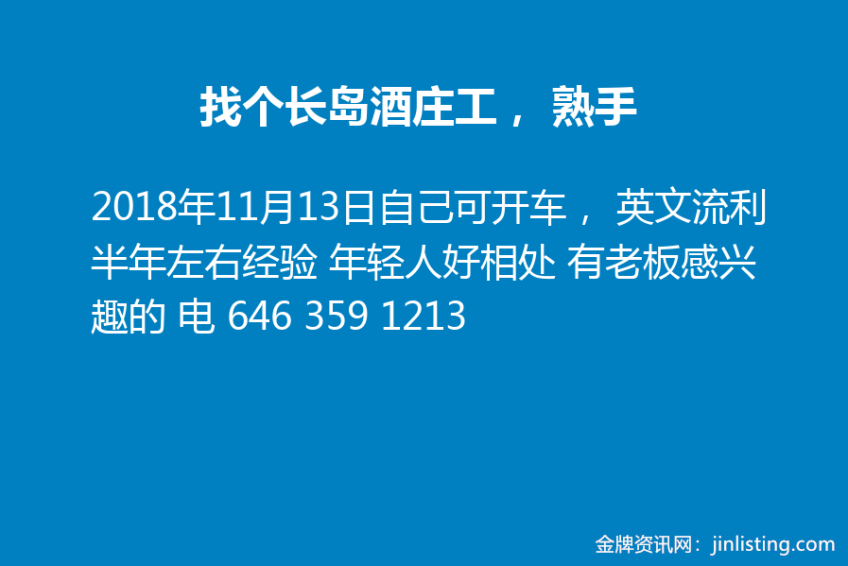 自己可开车, 英文流利 半年左右经验 年轻人好相处 有老板感兴趣的 电 646 359 1213