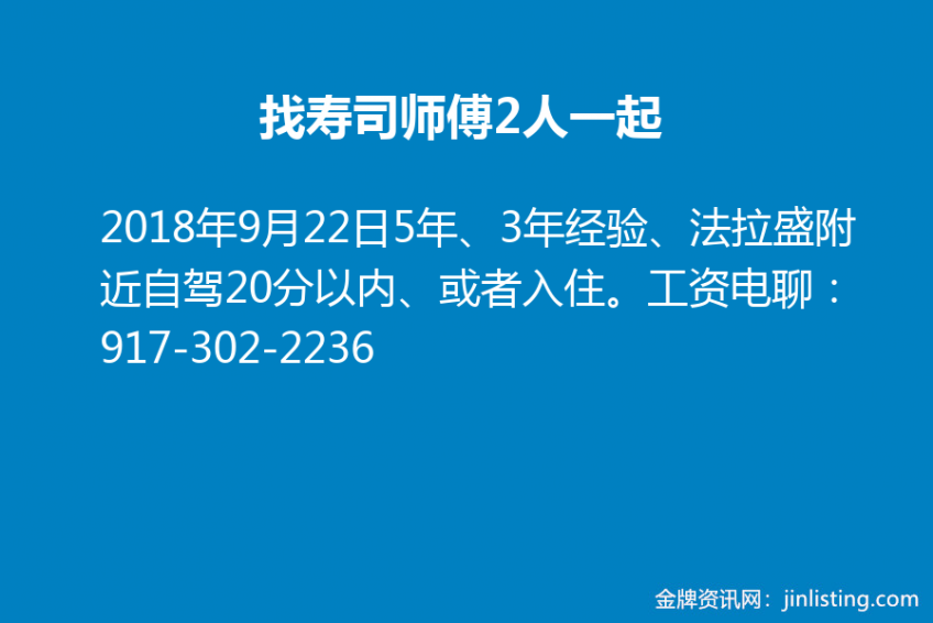 5年、3年经验、法拉盛附近自驾20分以内、或者入住。工资电聊:917-302-2236