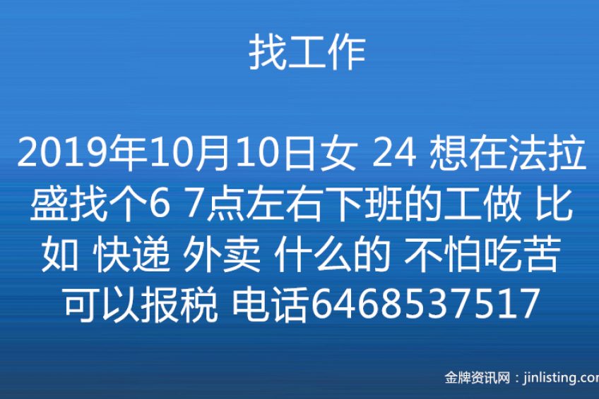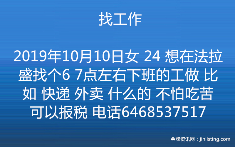 找工作呀 女 24 想在法拉盛找个6 7点左右下班的工做 比如 快递 外卖 什么的 不怕吃苦 可以报税 电话6468537517