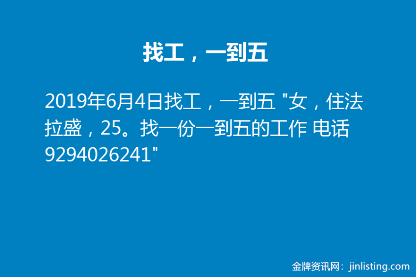 找工,一到五 “女,住法拉盛,25。找一份一到五的工作 电话9294026241”