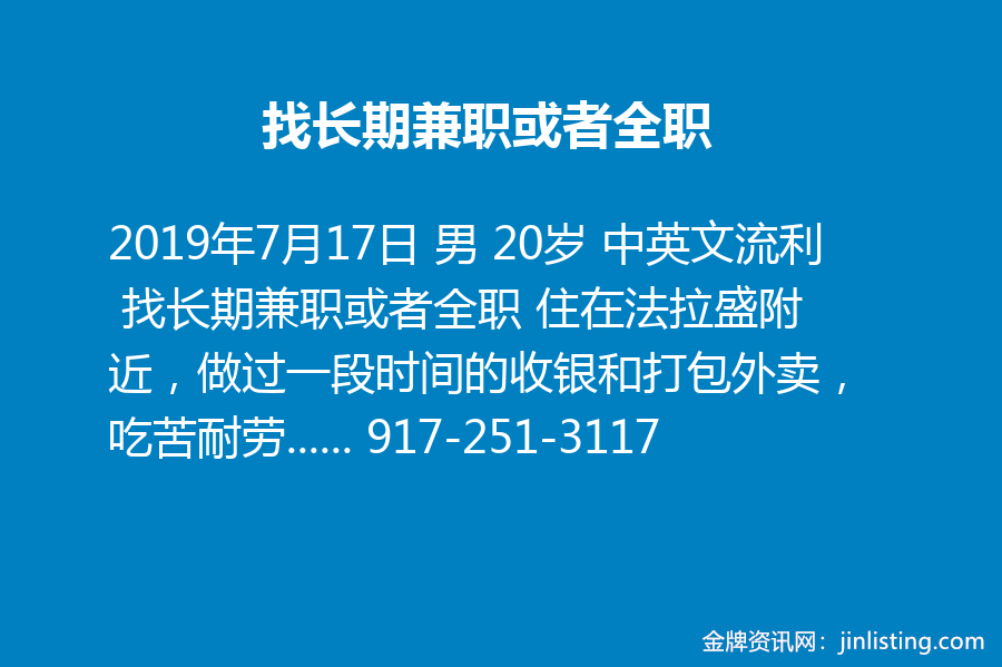 男 20岁 中英文流利 找长期兼职或者全职 住在法拉盛附近,做过一段时间的收银和打包外卖,吃苦耐劳,不会的肯学。有意者请发短信致 917-251-3117