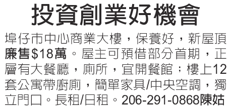 埠仔市中心商業大樓 保養好 新屋頂 廉售$18萬 屋主可預借部分首期 正層有大餐廳 男女厠所 宜開餐館 樓上12套公寓 各有廚厠 簡單家具 中央空調 獨立門口 長租或日租 206-291-0868陳姑