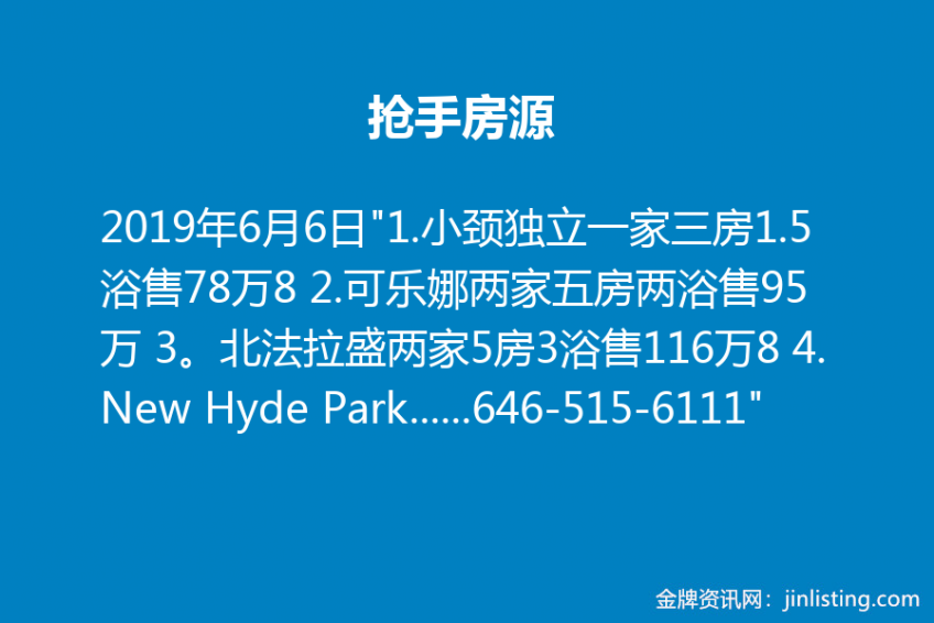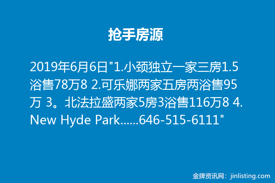 抢手房源 “1.小颈独立一家三房1.5 浴售78万8 2.可乐娜两家五房两浴售95万 3。北法拉盛两家5房3浴售116万8 4.New Hyde Park 一家售75万9 5.Woodhaven 两家4房2浴售89万9 6.Woodhaven 两家售86万5 7.Woodhaven 单边两家7房3浴售89万9 8.Woodhaven 单边两家7房2浴售95万9 9.Richmond Hill 独立一家5房3.5浴售79万5 10.法拉盛单边一家3房1.5浴售78万 11。Bronx 单边两家6房4浴售92万5 12.Bronx 两家5房2浴售85万9 13.Bronx 两家6房2浴售79万9 14.Bronx 两家售75万 15。东 Elmhurst 一家3房2浴售78万 16.Bayside 独立一家售85万9 欢迎来电咨询经纪陈小姐:646-515-6111”