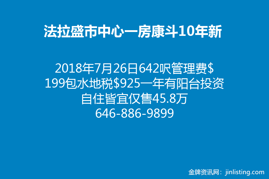法拉盛中心 10年新 一房一厅康斗 642呎 管理费$199 包水 地税$925 一年.有阳台,洗衣机烘干机,格局好,精美装修,交通便利,静中带旺,投资自住皆宜! 仅售45.8万