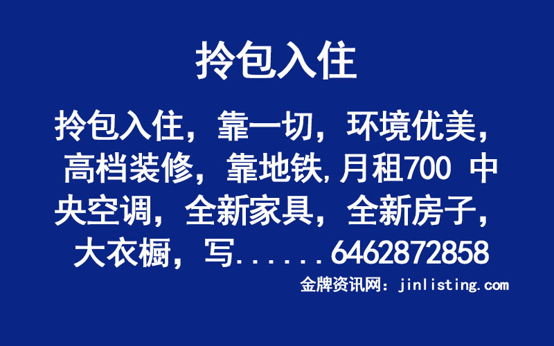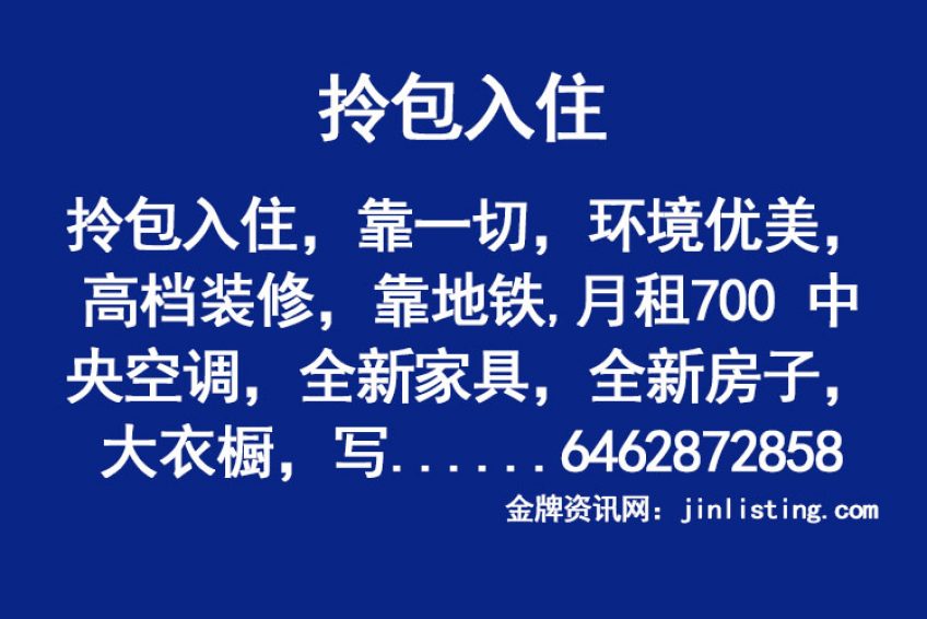 拎包入住,靠一切,环境优美,高档装修,靠地铁,月租700 中央空调,全新家具,全新房子,大衣橱,写字台,独立卫生间大房主卧,次卧, 环境优美,生活方便,新泽西购物税低,靠地铁,去世贸中心15分钟,去曼哈顿33街25分钟,有意者联系mary 6462872858