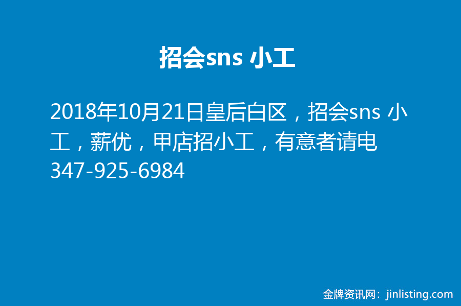 皇后白区,招会sns 小工,薪优,  甲店招小工,有意者请电347-925-6984