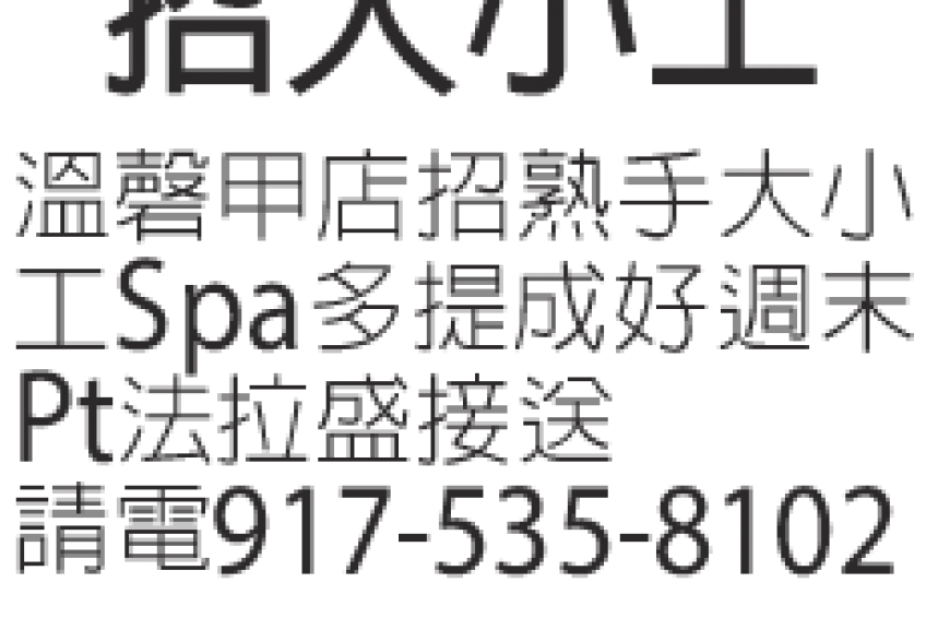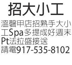 溫磬甲店發盛接送招熟手大小工spa多提成好週末Pt 電917-535-8102