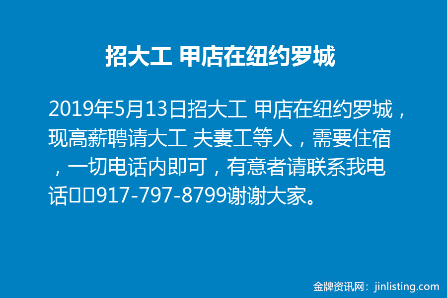 招大工 甲店在纽约罗城,现高薪聘请大工 夫妻工等人,需要住宿,一切电话内即可,有意者请联系我电话☎️917-797-8799谢谢大家。