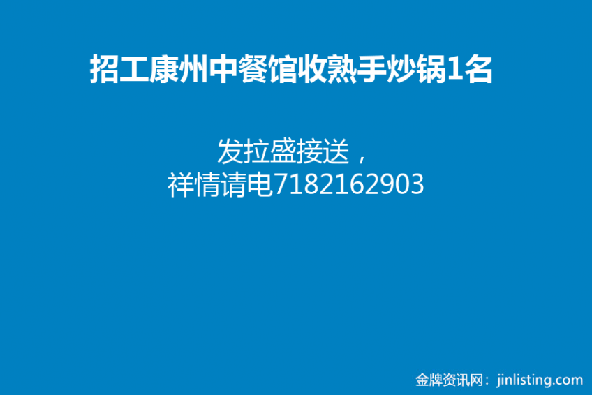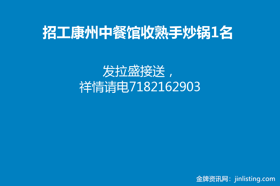 (招工)康州中餐馆收熟手炒锅1名,发拉盛接送,祥情请电7182162903