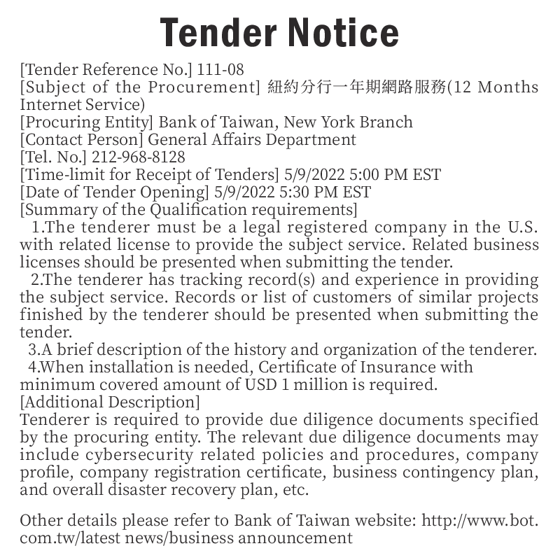 【采购单位】台湾银行纽约分行