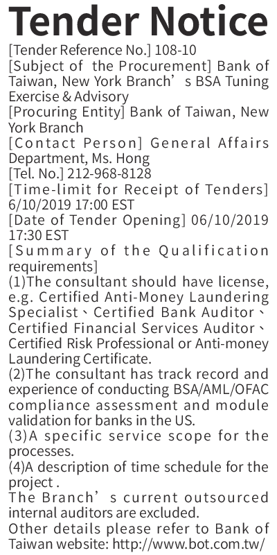 [采购主题]台湾银行纽约分行BSA调整演习及咨询