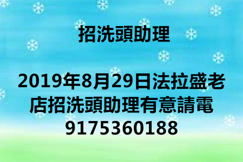 法拉盛老店招洗頭助理有意請電9175360188