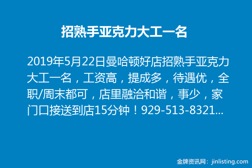 曼哈顿好店招熟手亚克力大工一名,工资高,提成多,待遇优,全职/周末都可,店里融洽和谐,事少,家门口接送到店15分钟!电话:929-513-8321!欢迎电话询问