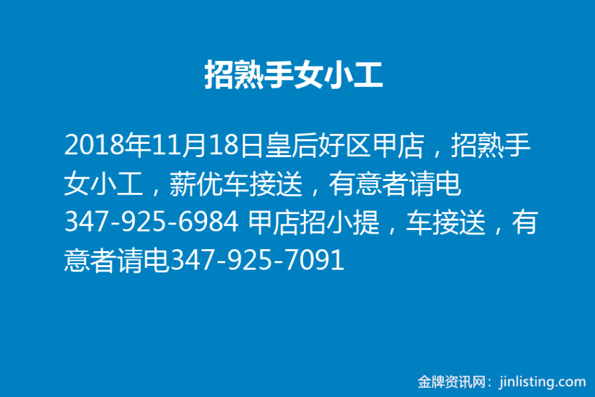 皇后好区甲店,招熟手女小工,薪优车接送,有意者请电347-925-6984 甲店招小提,车接送,有意者请电347-925-7091