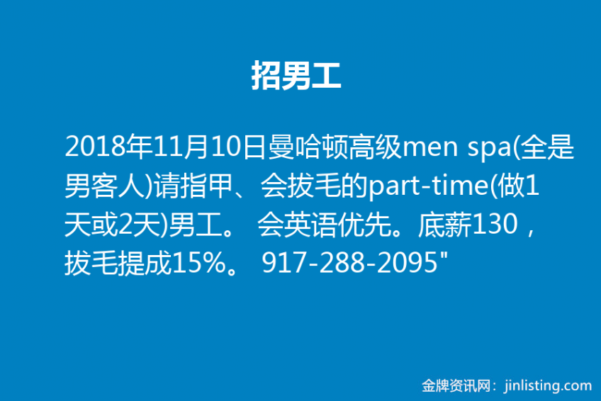 “㊗️招男工,底薪130㊗️曼哈顿高级men spa(全是男客人)请指甲、会拔毛的part-time(做1天或2天)男工。 会英语优先。底薪130,拔毛提成15%。 917-288-2095”
