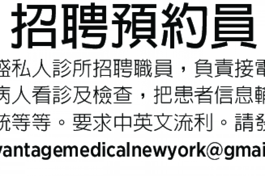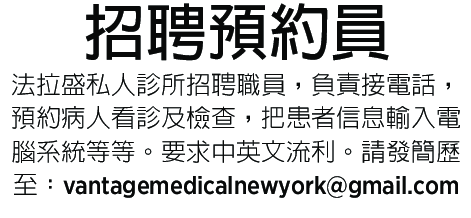法拉盛私人診所招聘職員,負責接電話,預約病人看診及檢查,把患者信息輸入電腦系統等等。要求中英文流利。請發簡歷至:vantagemedicalnewyork@gmail.com
