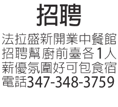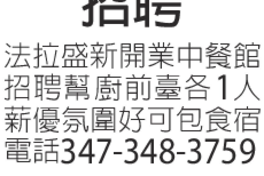 法拉盛新開業中餐館招聘幫廚、前臺各1人,薪優,氛圍好,可包食宿。聯繫電話