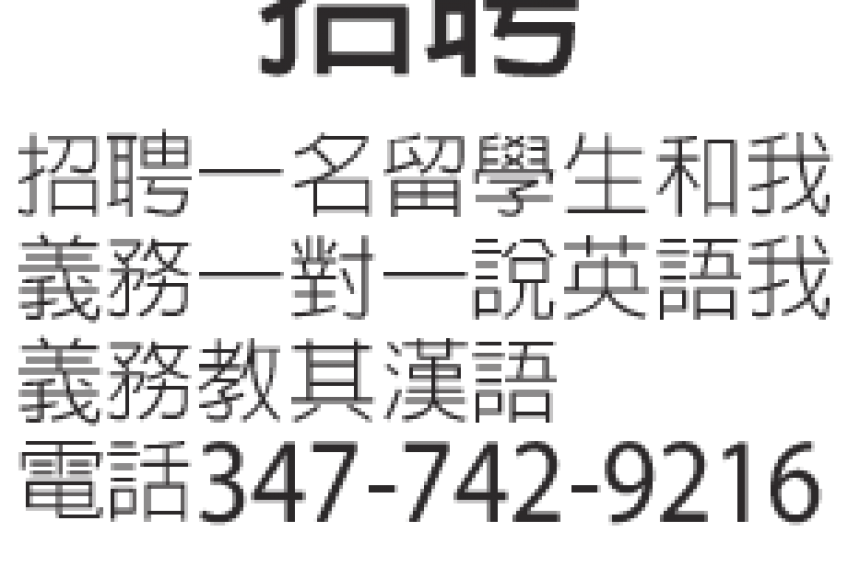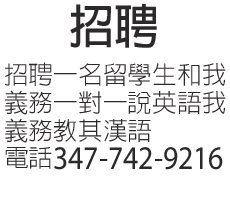 招聘一名留學生和我義務一對一說英語,我義務教其漢語,聯繫電話347-742-9216