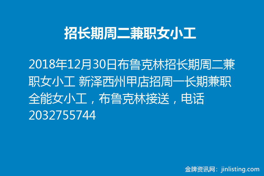 布鲁克林招长期周二兼职女小工 新泽西州甲店招周一长期兼职全能女小工,布鲁克林接送,电话2032755744