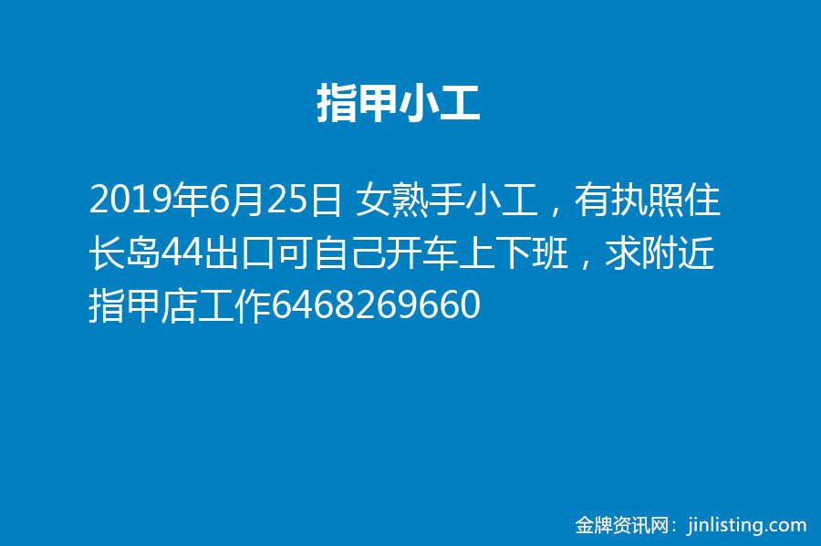 指甲小工 女熟手小工,有执照住长岛44出口可自己开车上下班,求附近指甲店工作6468269660