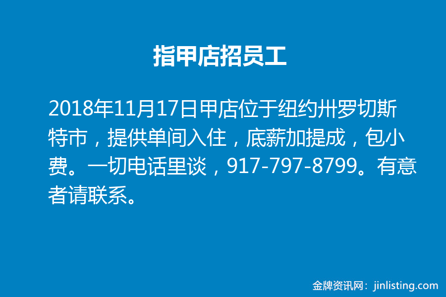 指甲店招员工 甲店位于纽约卅罗切斯特市,提供单间入住,底薪加提成,包小费。一切电话里谈,917-797-8799。有意者请联系。