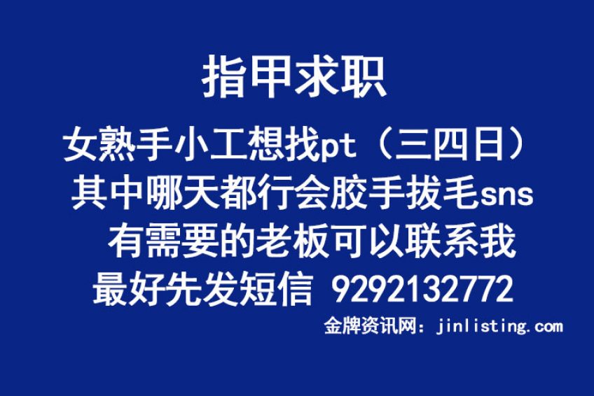 指甲求职 女熟手小工 想找pt(三四日)其中哪天都行 会胶手拔毛 sns 有需要的老板可以联系我 最好先发短信 9292132772