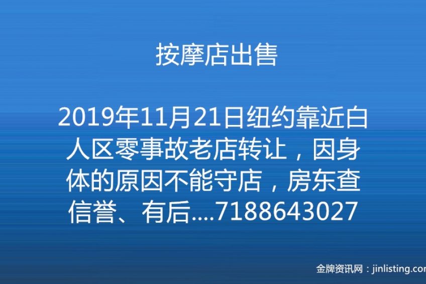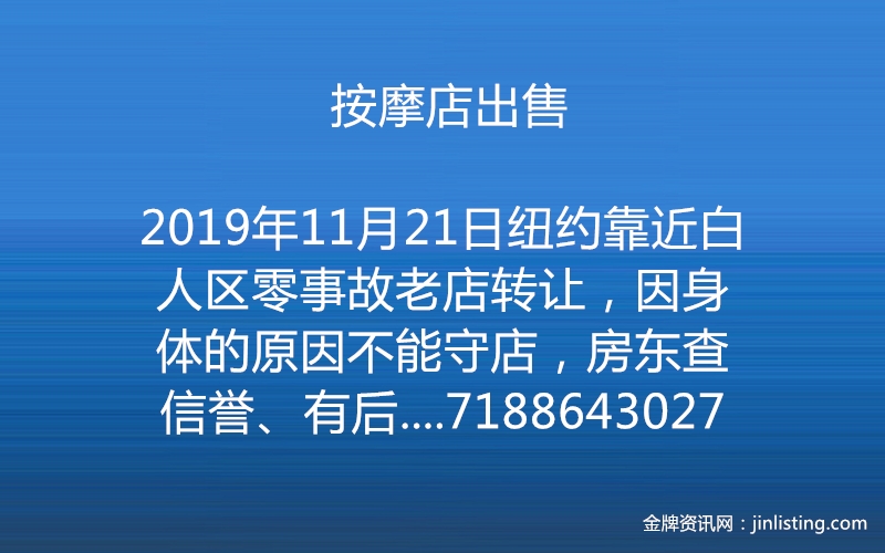 按摩店出售 纽约靠近白人区零事故老店转让,因身体的原因不能守店,房东查信誉、有后门4个房间,一天十几个工忍痛出售,请电7188643027闲打听勿扰,随时看店