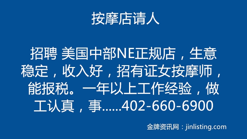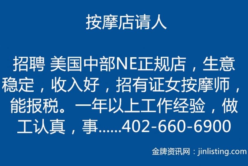 招聘 美国中部NE正规店,生意稳定,收入好,招有证女按摩师,能报税。一年以上工作经验,做工认真,事少, 住宿条件佳。老板好相处。无证可帮助申请NE州执照,需绿卡 小时证 全美或联邦证 。 黄手勿扰。 联系方式:402-660-6900