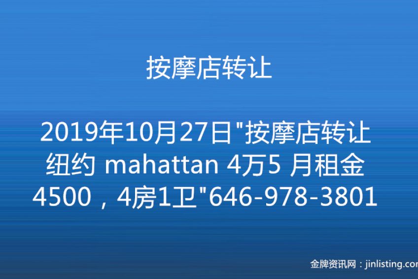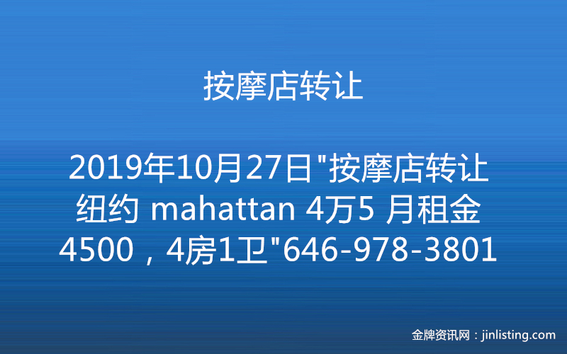 “按摩店转让纽约 mahattan 4万5 646-978-3801 月租金4500,4房1卫”