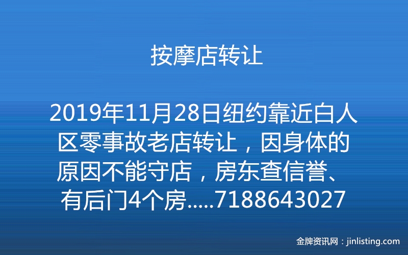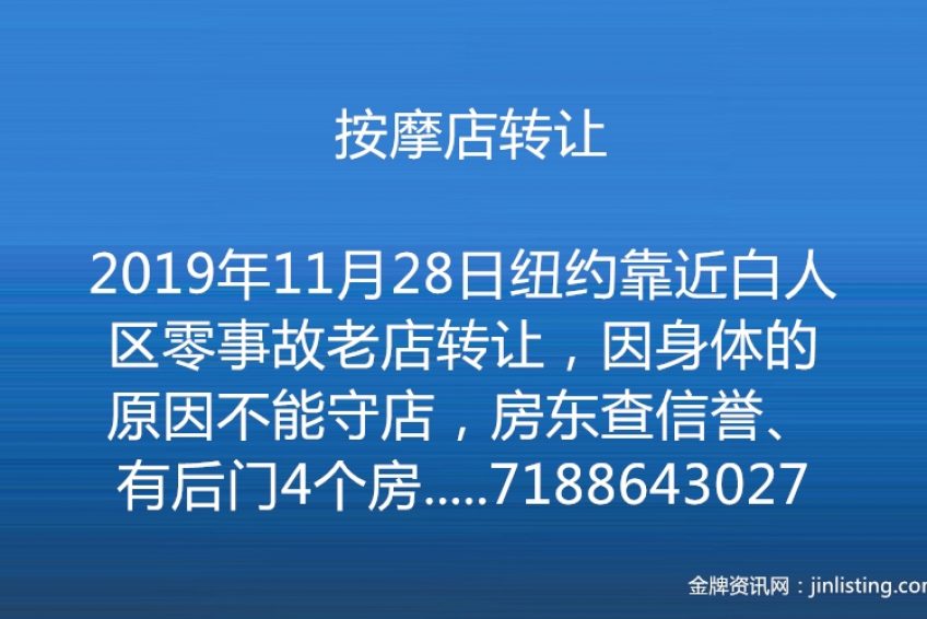 按摩店转让 纽约靠近白人区零事故老店转让,因身体的原因不能守店,房东查信誉、有后门4个房间,一天十几个工忍痛出售,请电7188643027闲打听勿扰,随时看店