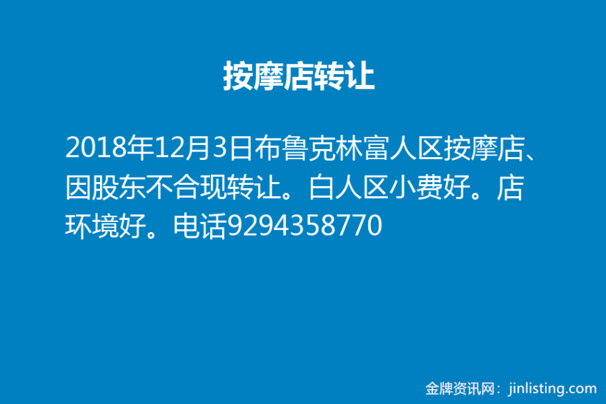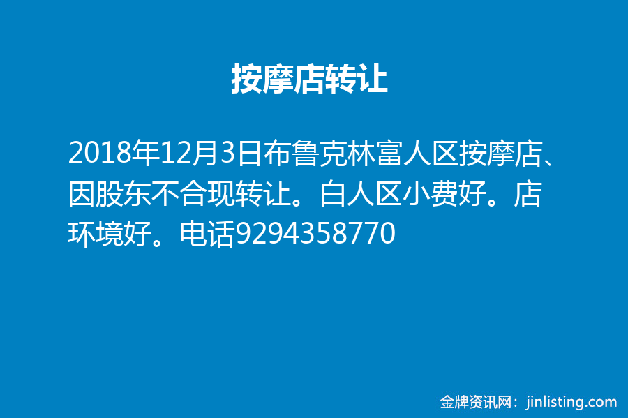 布鲁克林富人区按摩店、因股东不合现转让。白人区小费好。店环境好。电话9294358770