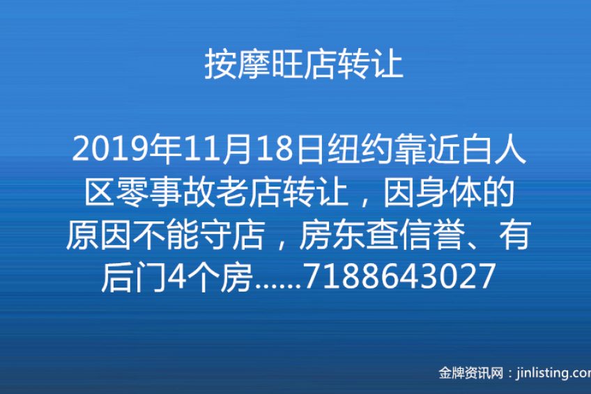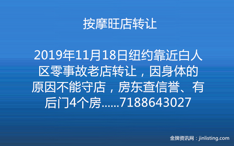 按摩旺店转让 纽约靠近白人区零事故老店转让,因身体的原因不能守店,房东查信誉、有后门4个房间,一天十几个工忍痛出售,请电7188643027闲打听勿扰,随时看店